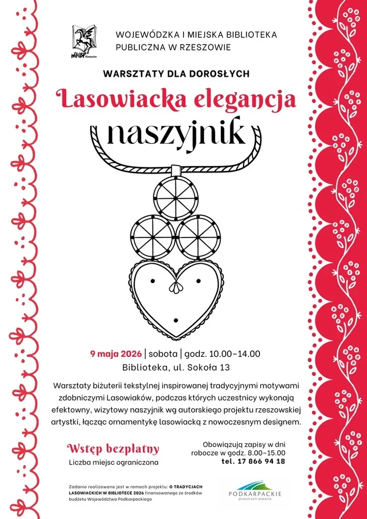 Warsztaty pod hasłem „Lasowiacka elegancja - naszyjnik” odbędą się w sobotę, 9 maja 2026 r., w godz. 10.00-14.00. Gospodarzem spotkania będzie Biblioteka przy ul. Sokoła 13. Udział jest bezpłatny, ale trzeba się wcześniej zgłosić - zapisy prowadzone są w dni robocze w godz. 8.00-15.00 pod numerem telefonu 17 866 94 18.