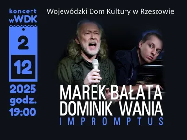 Serdecznie zapraszamy na niezwykły, nastrojowy i pełen improwizacji koncert duetu Marek Bałata & Dominik Wania, który odbędzie się już 2 grudnia w Wojewódzkim Domu Kultury w Rzeszowie. To spotkanie dwóch artystów o wyjątkowej wrażliwości i ogromnej muzycznej wyobraźni.